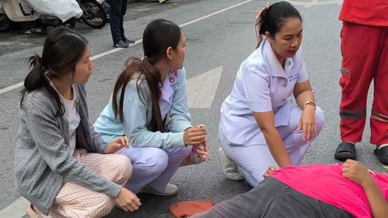 วันที่ 27 มิ.ย.2568 ผู้สื่อข่าวรายได้รับคลิปวิดีโอ ปรากฏภาพขณะที่เจ้าหน้าที่พยาบาลสาว 3 คน กำลังให้การช่วยเหลือชายหมดสติอยู่กลางถนน ตรงข้ามธนาคารกสิกรไทย ต.ในเมือง อ.พิมาย จ.นครราชสีมา โดยในภาพจะเห็นว่าพยาบาลทั้ง 3 คน ได้ตรวจชีพจรของชายคนดังกล่าว ก่อนที่จะโทรศัพท์แจ้งให้ทางรถกู้ชีพมารับตัวชายคนดังกล่าวนำส่งโรงพยาบาลพิมาย