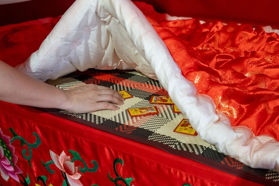 โดยหลังจากอธิษฐานเรียบร้อยแล้ว ให้ใช้มือทั้งสองข้างทำท่าโกยเข้าหาตัวจำนวน 3 ครั้งจากนั้นล้วงเข้าไปใต้ผ้าห่มเพื่อคลำหาของ เชื่อกันว่า หากคลำพบเมล็ดบัวหมายถึงจะได้ลูก หรือหากคลำเจอซองใส่เงินนำโชค ก็จะพบกับความร่ำรวยในปีที่กำลังจะมาถึง วันที่ผู้คนนิยมมาสักการะวัดแห่งนี้คือ วันเทศกาลเจ้าแม่ทับทิม