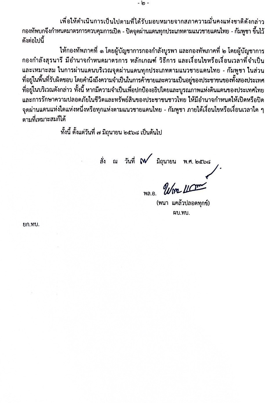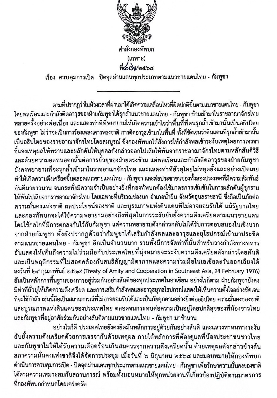 อย่างไรก็ดี ประเทศไทยยังคงยึดมั่นหลักการอยู่ด้วยกันอย่างสันติ และแสวงหา หนทางระงับยับยังความตึงเครียดด้วยการเจรจากันด้วยเหตุผล ภายใต้หลักการที่ต้องดูแลพี่น้อง ประชาชนชาวไทยและกัมพูชาไม่ให้ได้รับความเดือดร้อนเกินสมควรจากความตึงเครียดนั้น ด้วยเหตุผลดังกล่าวข้างต้น สภาความมั่นคงแห่งชาติ ในการประชุมเมื่อวันที่ ๖ มิถุนายน ๒๕๖๘ จึงได้มอบหมายให้กองทัพบกดำเนินการควบคุมการเปิด-ปิดจุดผ่านแดนทุกประเภทตามแนว ชายแดนไทย-กัมพูชา เพื่อรักษาความมั่นคงของชาติได้ตามความเหมาะสมกับสถานการณ์ กับมอบหมายให้ทุกหน่วยงานที่เกี่ยวข้องปฏิบัติตามที่กองทัพบกกำหนดโดยเคร่งครัด เพื่อให้ดำเนินการเป็นไปตามที่ได้รับมอบหมายจากสภาความมั่นคงแห่งชาติ ดังกล่าว