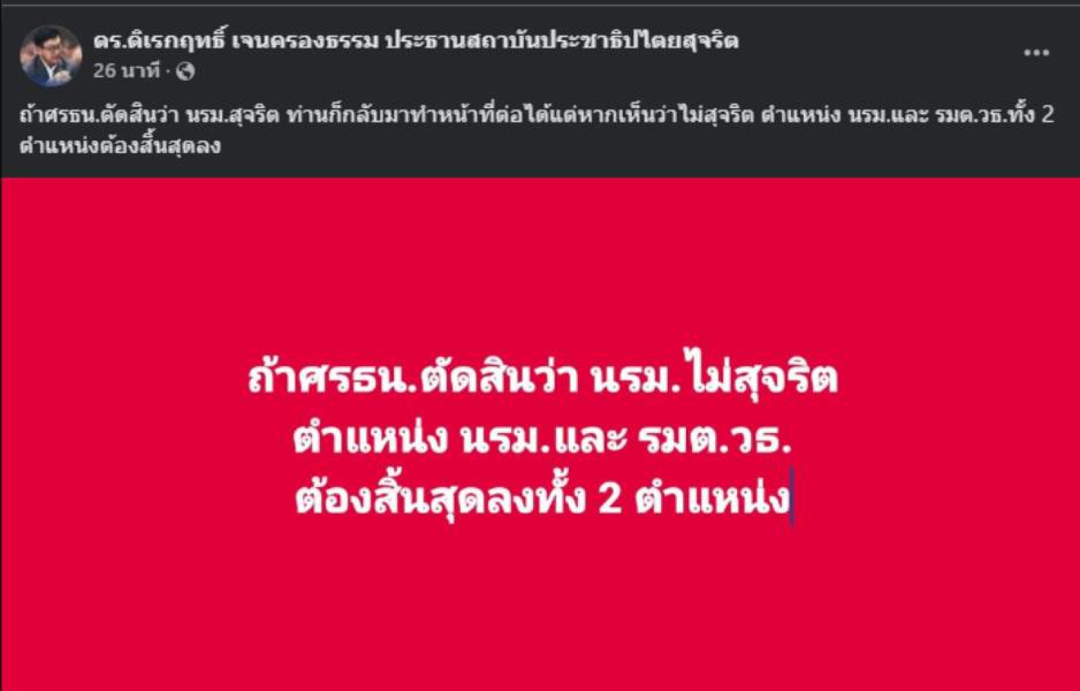 ถ้าศรธน.ตัดสินว่า นรม.สุจริต ท่านก็กลับมาทำหน้าที่ต่อได้แต่หากเห็นว่าไม่สุจริต ตำแหน่ง นรม.และ รมต.วธ.ทั้ง 2 ตำแหน่งต้องสิ้นสุดลง
