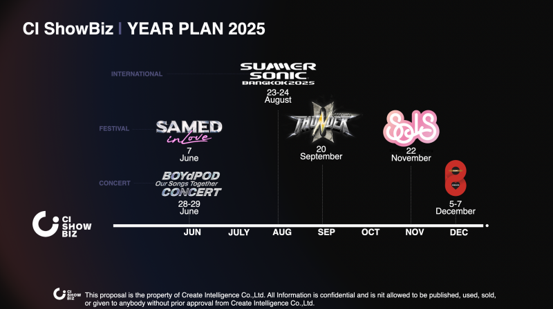 โดยCI ShowBiz กำลังจะมีโปรเจกต์สำคัญที่จะเกิดขึ้นในครึ่งปีหลัง คือกลุ่มธุรกิจโชว์บิซ โดยจัดงานต่อเนื่องจนเป็นนับผู้นำในอันดับต้นๆ อาทิSamed in Love 2025 และThunder Rock Festival 2 และปิดท้ายปลายปีด้วยSeason of Love Song 15 และไฮไลต์สำคัญ คือ2 คอนเสิร์ตใหญ่ คือBOYdPOD Our Songs Together Concert คอนเสิร์ตใหญ่ในรอบ16 ปีของ บอย โกสิยพงษ์ และ ป๊อด ธนชัย อุชชิน และคอนเสิร์ตใหญ่ในรอบ20 ปี ของค่ายเพลงเบเกอรี่ มิวสิค นำทีมโดยบอย โกสิยพงษ์, สุกี้ กมล สุโกศล แคลป์ และสมเกียรติ อริยะชัยพาณิชย์ พร้อมนักร้องในสังกัดนำเสนอผลงานเพลงมากกว่า100 เพลง บนเวทีB.DAY Forever Concertและอีกงานในปีนี้ คือSummer Sonic Bangkok 2025 โดยมีCI ShowBiz ทำหน้าที่บริหารจัดการในฐานะLocal Promoter ทั้ง6 งานใหญ่ในครึ่งปีนี้