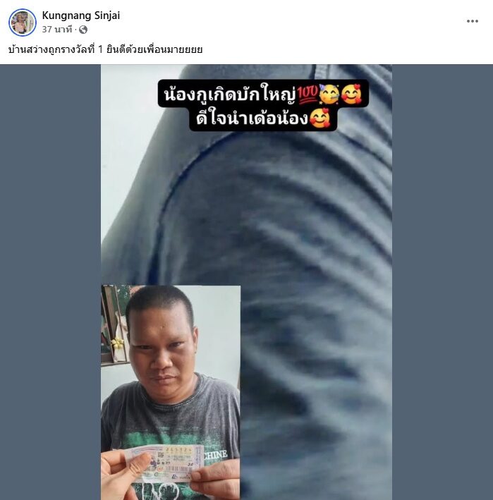 ล่าสุด สมาชิกเฟซบุ๊ก "Kungnang Sinjai" โพสต์ภาพของชายหนุ่มผู้โชคดี หลังถูกรางวัลที่ 1 งวดนี้ ได้รับเงินรางวัล 6 ล้านบาท โดยระบุข้อความว่า "บ้านสว่างถูกรางวัลที่ 1 ยินดีด้วยเพื่อนมายยยย"