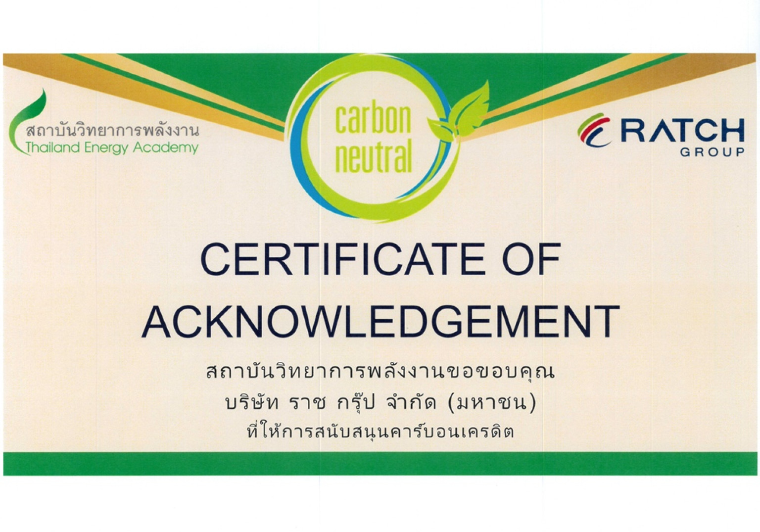 บริษัท ราช กรุ๊ป จำกัด (มหาชน) มอบคาร์บอนเครดิตจำนวน 40 ตันคาร์บอนไดออกไซด์เทียบเท่า (tCO2eq) จากโครงการเพิ่มประสิทธิภาพการใช้พลังงานด้วยการปรับเปลี่ยนอุปกรณ์ไฟฟ้าแสงสว่างเป็นหลอด LED ของโรงไฟฟ้าราชบุรีสนับสนุนกิจกรรมการอบรมหลักสูตรผู้บริหารระดับสูงด้านวิทยาการพลังงาน รุ่นที่ 21 (วพน. 21) ของสถาบันวิทยาการพลังงาน การนี้ นายประเสริฐ สินสุขประเสริฐ ปลัดกระทรวงพลังงาน ได้มอบเกียรติบัตรแสดงความขอบคุณแก่ นางวดีรัตน์ เจริญคุปต์ รองกรรมการผู้จัดการใหญ่การเงิน บริษัท ราช กรุ๊ป จำกัด (มหาชน)