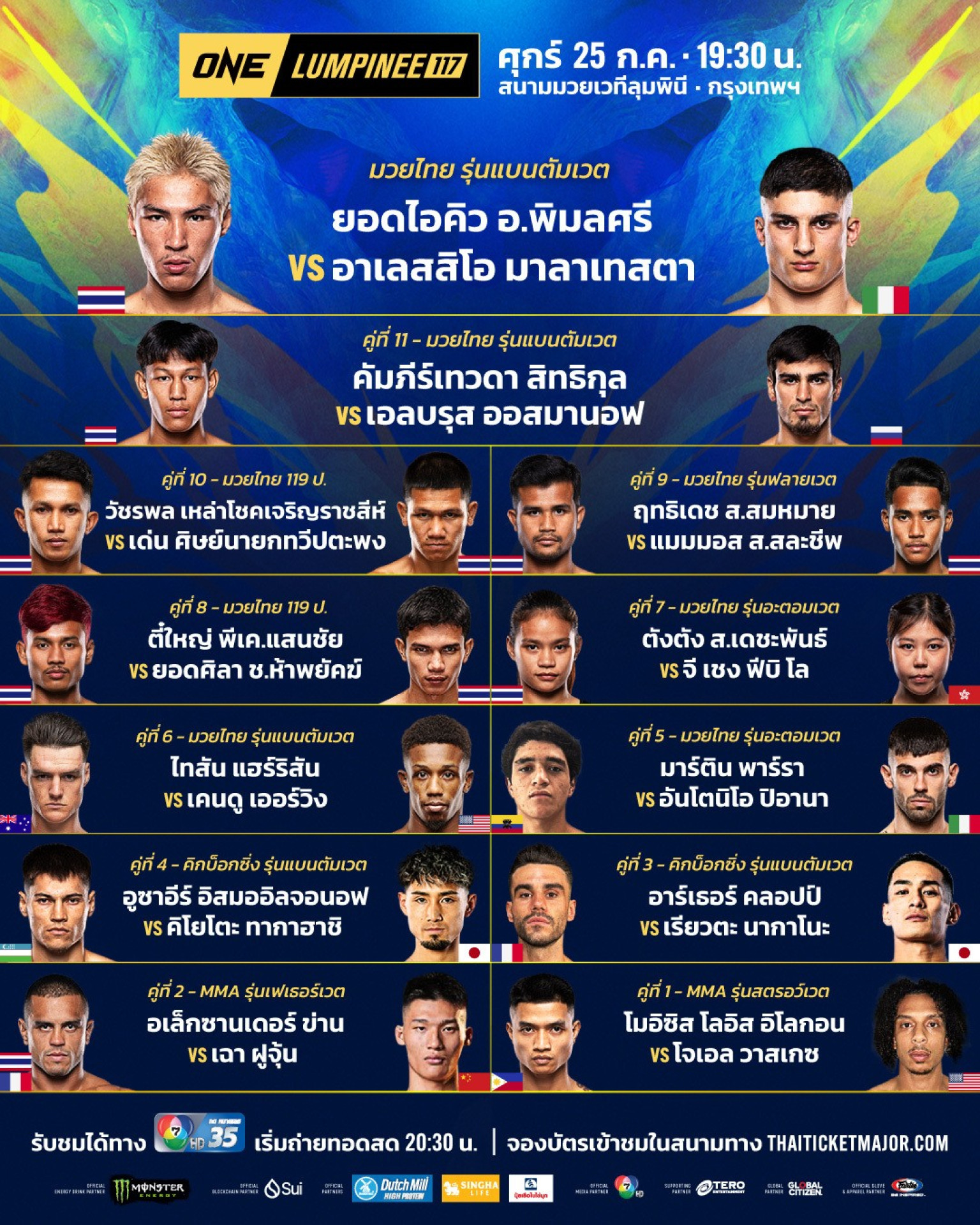 โปรแกรมการแข่งขันทุกคู่ศึก ONE ลุมพินี 117