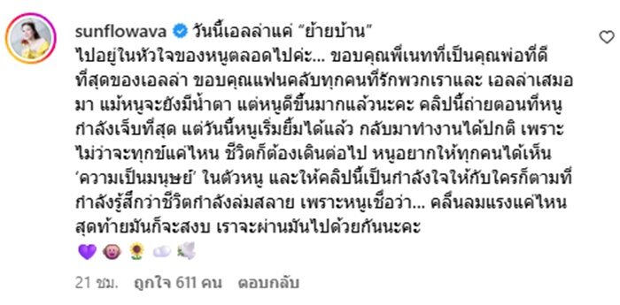 “วันนี้เอลล่าแค่ “ย้ายบ้าน” ไปอยู่ในหัวใจของหนูตลอดไปค่ะ… ขอบคุณพี่เนทที่เป็นคุณพ่อที่ดีที่สุดของเอลล่า ขอบคุณแฟนคลับทุกคนที่รักพวกเราและ เอลล่าเสมอมา แม้หนูจะยังมีน้ำตา แต่หนูดีขึ้นมากแล้วนะคะ คลิปนี้ถ่ายตอนที่หนูกำลังเจ็บที่สุด แต่วันนี้หนูเริ่มยิ้มได้แล้ว กลับมาทำงานได้ปกติ เพราะไม่ว่าจะทุกข์แค่ไหน ชีวิตก็ต้องเดินต่อไป หนูอยากให้ทุกคนได้เห็น ‘ความเป็นมนุษย์’ ในตัวหนู และให้คลิปนี้เป็นกำลังใจให้กับใครก็ตามที่กำลังรู้สึกว่าชีวิตกำลังล่มสลาย เพราะหนูเชื่อว่า… คลื่นลมแรงแค่ไหน สุดท้ายมันก็จะสงบ เราจะผ่านมันไปด้วยกันนะคะ”