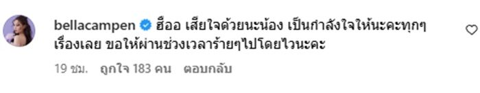 ขณะที่ เบลล่า ราณี ก็เข้ามาคอมเมนต์ให้กำลังใจด้วยว่า “ฮืออ เสียใจด้วยนะน้อง เป็นกำลังใจให้นะคะทุกๆเรื่องเลย ขอให้ผ่านช่วงเวลาร้ายๆไปโดยไวนะคะ”
