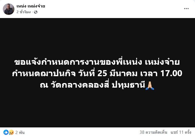 แจ้งเลื่อนพิธีฌาปนกิจ เหน่ง เหม่งจ๋าย