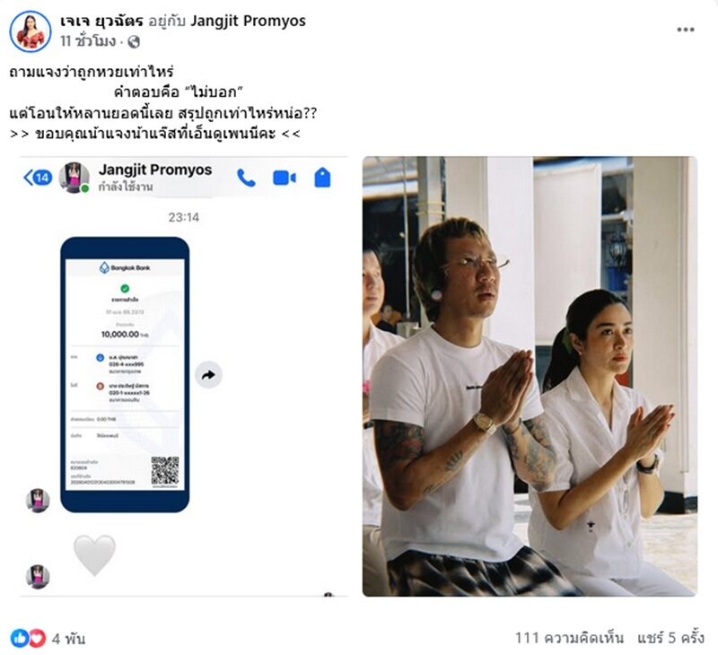 ก่อนที่ เจเจ จะโพสต์ภาพสลิปโอนเงินจาก แจง ให้ น้องเพนนี ลูกสาวของ เหน่ง กับ เจเจ พร้อมแคปชั่นด้วยว่า “ถามแจงว่าถูกหวยเท่าไหร่ คำตอบคือ “ไม่บอก”แต่โอนให้หลานยอดนี้เลย สรุปถูกเท่าไหร่หน่อ?? >> ขอบคุณน้าแจงน้าแจ๊สที่เอ็นดูเพนนีคะ <<”