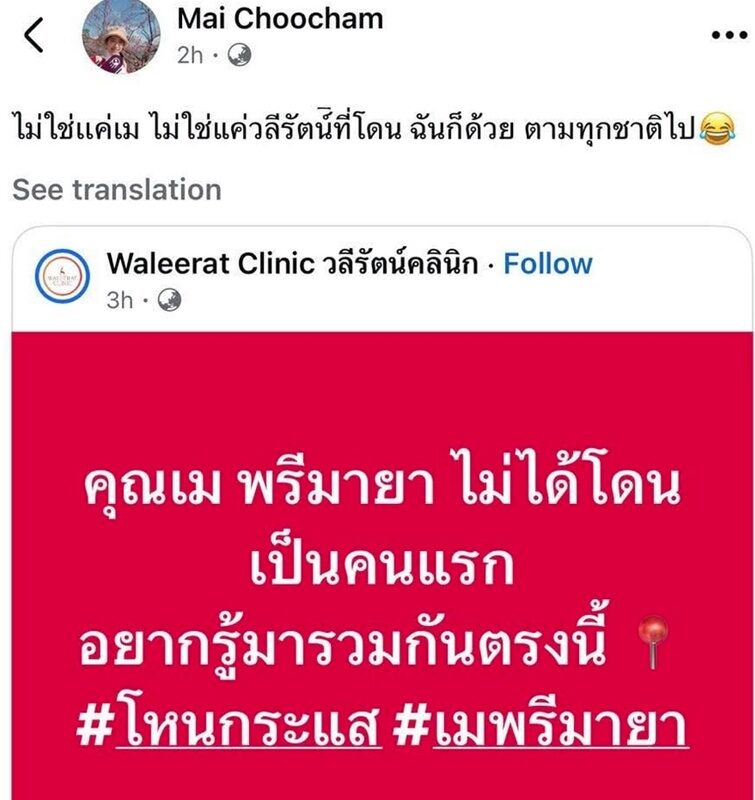 “ต้นเรื่องจากโพสต์เพจ Waleerat Clinic โดย โพสต์ข้อความว่า "คุณเม พรีมายา ไม่ได้โดนเป็นคนแรก อยากรู้มารวมกันตรงนี้"”