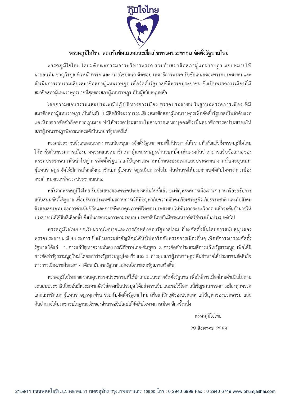 พรรคประชาชนจึงเสนอแนวทางการสนับสนุนการจัดตั้งรัฐบาล ตามที่ได้ประกาศให้ทราบทั่วกันแล้ว ซึ่งพรรคภูมิใจไทยได้หารือกับพรรคการเมืองบางพรรคและสมาชิกสภาผู้แทนราษฎรจำนวนหนึ่ง เห็นตรงกันว่าสามารถรับข้อเสนอของ พรรคประชาชน เพื่อนำไปสู่การจัดตั้งรัฐบาลแก้ปัญหาเฉพาะหน้าของประเทศและประชาชน จากนั้นจะยุบสภาผู้แทนราษฎร จัดให้มีการเลือกตั้งสมาชิกสภาผู้แทนราษฎรเป็นการทั่วไป คืนอำนาจให้ประชาชนตัดสินใจทางการเมือง ตามกำหนดเวลาที่พรรคประชาชนเสนอ