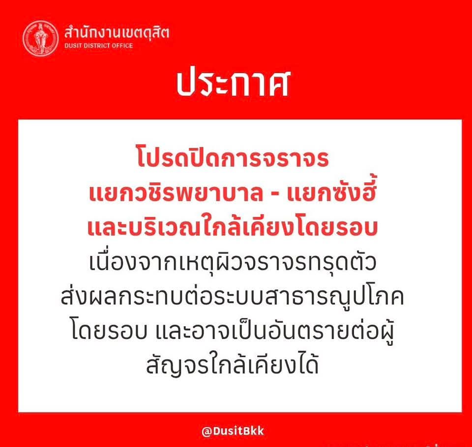 สำนักงานเขตดุสิตรายงานว่า เวลา 07.40 น. ปิดการจราจรแยกวชิรพยาบาล-แยกซังฮี้ และบริเวณใกล้เคียงโดยรอบ เนื่องจากเหตุผิวจราจรทรุดตัว ส่งผลกระทบต่อระบบสาธารณูปโภคโดยรอบ และอาจเป็นอันตรายต่อผู้สัญจรใกล้เคียงได้