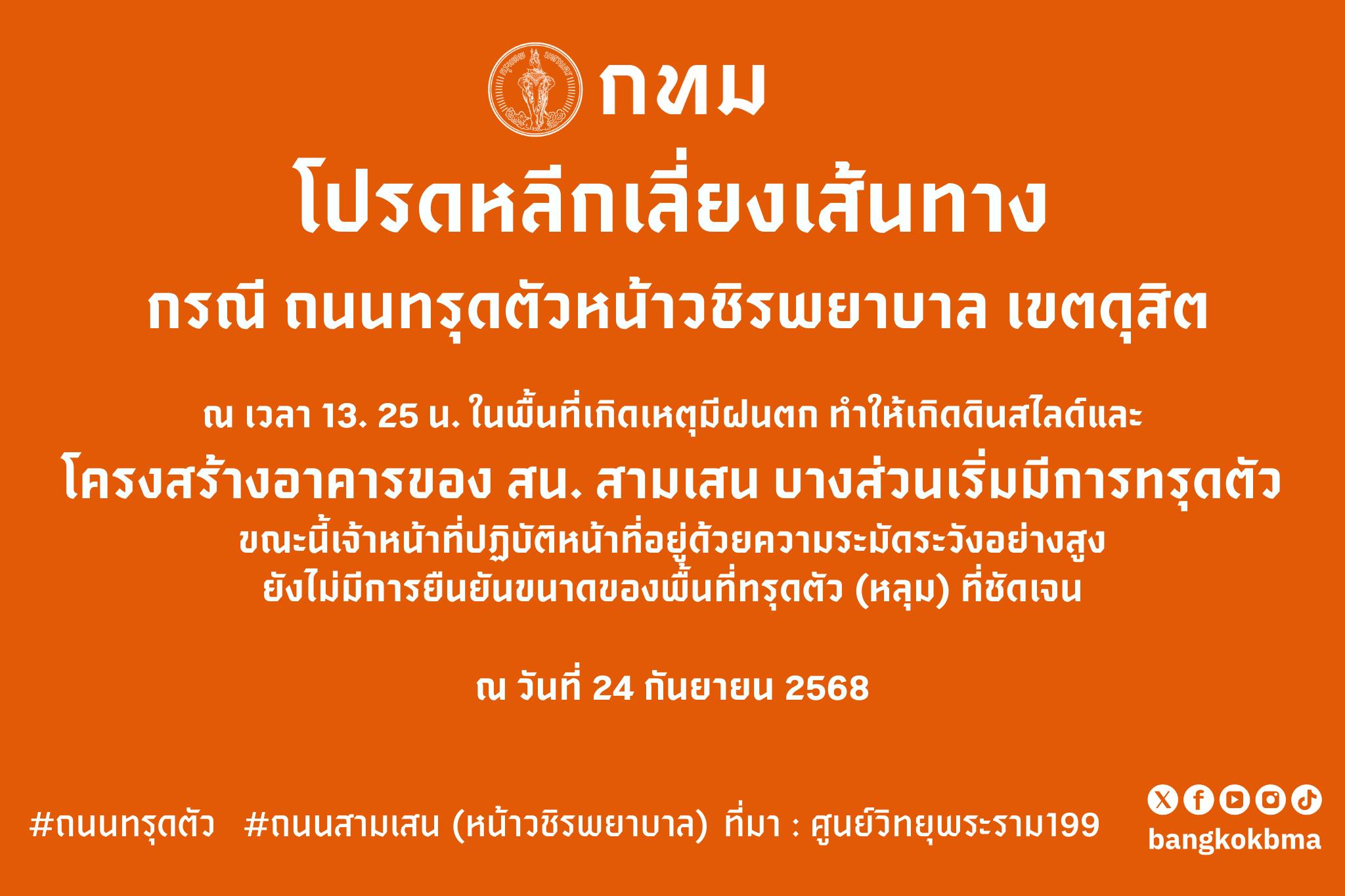 ประกาศดังกล่าวระบุว่า ด้วยวันที่ 24 กันยายน 2568 เวลาประมาณ 07.08 น. ได้เกิดเหตุถนนทรุดตัวขนาดใหญ่ บริเวณถนนสามเสนทั้งสองฝั่งตั้งแต่แยกวชิรพยาบาลถึงแยกราชวิถี ซึ่งส่งผลกระทบให้เกิดปัญหาการจราจร การประกอบอาชีพ และการใช้ชีวิตประจำวันเป็นไปอย่างยากลำบาก ตลอดจนสิ่งสาธารณะของประชาชนได้รับความเสียหายในพื้นที่ และถนนอาจทรุดตัวเพิ่ม