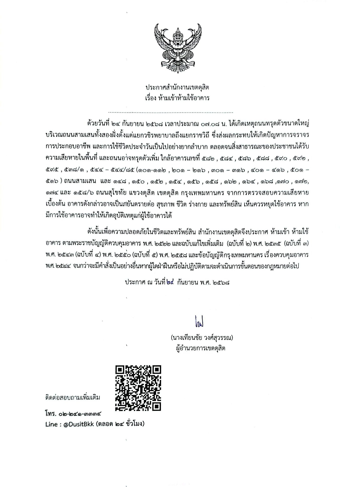 สำนักงานเขตดุสิต ออกประกาศห้ามเข้าห้ามใช้อาคาร ตามพระราชบัญญัติควบคุมอาคาร พ.ศ. 2522 และฉบับแก้ไขเพิ่มเติม (ฉบับที่ 2) พ.ศ. 2535 (ฉบับที่ 3) พ.ศ. 2543 (ฉบับที่ 4) พ.ศ. 2550 (ฉบับที่ 5) พ.ศ. 2558 และข้อบัญญัติกรุงเทพมหานคร เรื่องควบคุมอาคาร พ.ศ. 2544