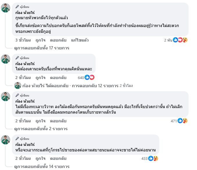 พร้อมทั้งคอมเมนต์รัวๆใต้โพสต์เพิ่มเติมอีกว่า “กูหมายหัวพวกมึงไว้ทุกตัวแล้ว ขี้เกียจส่งข้อความไปบอกครับก็เลยโพสต์ทิ้งไว้ให้คนที่กำลังทำร้ายน้องผมอยู่รู้ว่าทางไม่สะดวกหรอกเพราะยังมีกูอยู่”