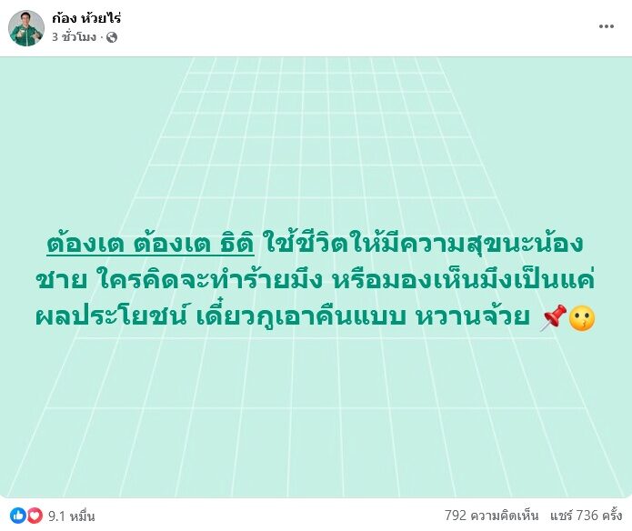 เกิดอะไรขึ้น ก้อง ห้วยไร่ โพสต์ถึงต้องเต ธิติ นักแสดง และ ผู้กำกับภาพยนตร์ดัง ว่า “ต้องเต ต้องเต ธิติ ใช้ชีวิตให้มีความสุขนะน้องชาย ใครคิดจะทำร้ายมึง หรือมองเห็นมึงเป็นแค่ ผลประโยชน์ เดี๋ยวกูเอาคืนแบบ หวานจ้วย ”