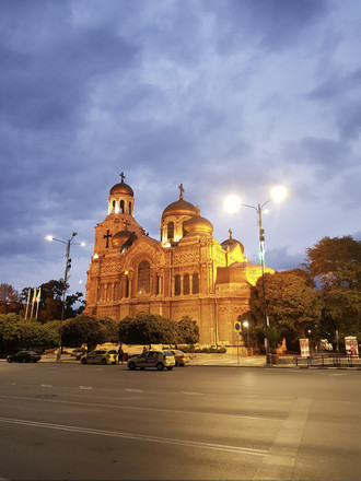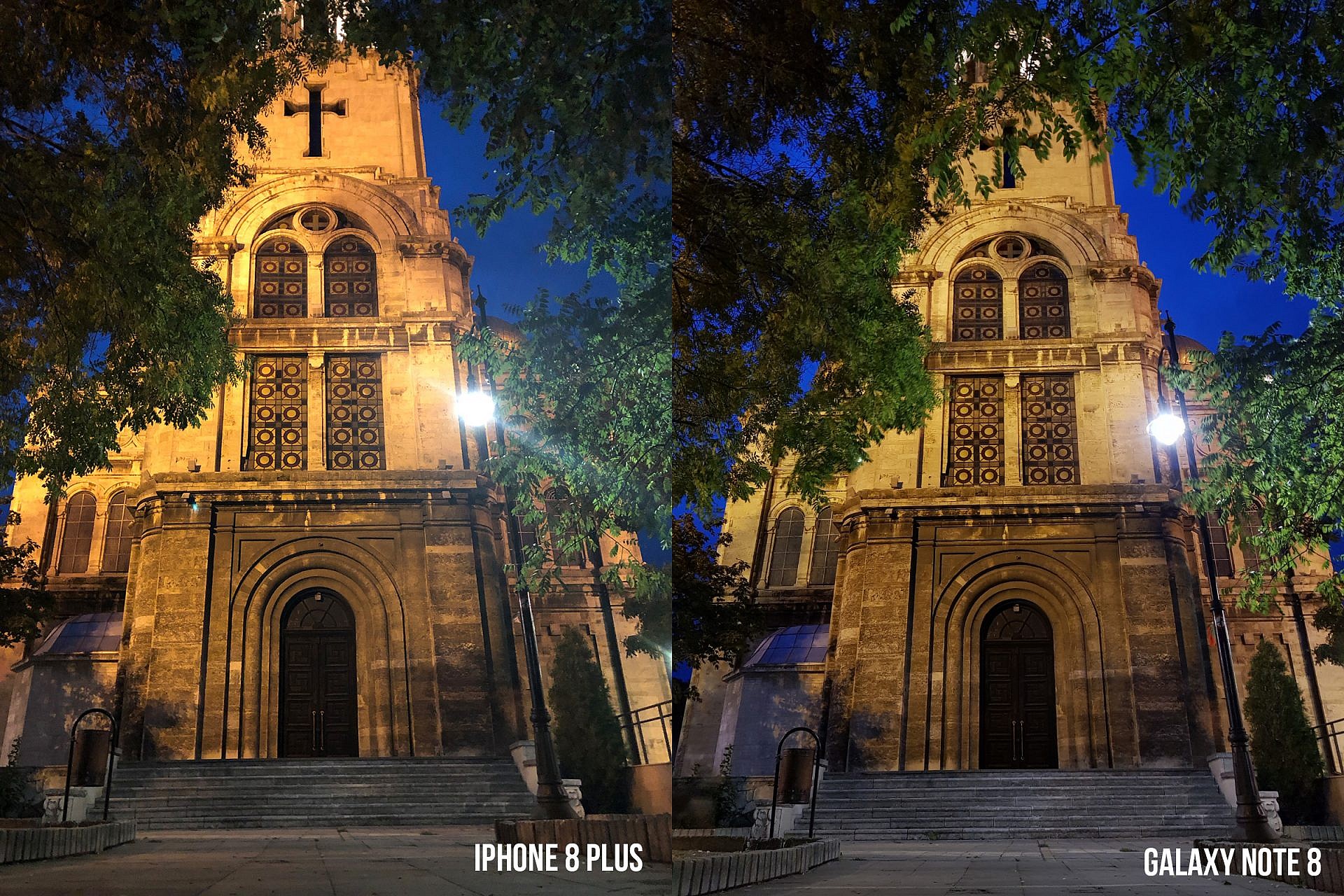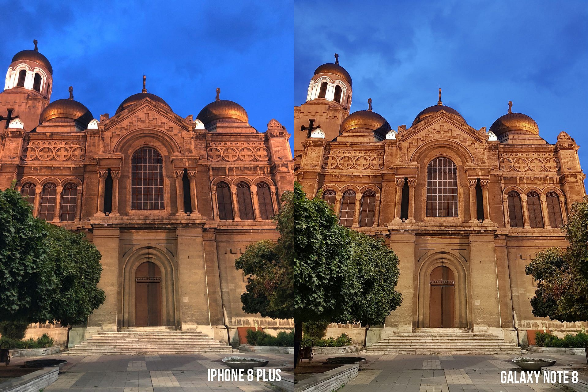 ต่อมาเป็นภาพโบสถ์ที่มีแสงตัดกับสีของท้องฟ้าอย่างชัดเจน โดย iPhone 8 Plus จะให้แสงที่นุ่มนวล และเย็นตามากกว่า แต่ในขณะเดียวกัน Galaxy Note 8 ก็ให้เก็บภาพออกมาได้ชัดมาก และแสดงให้เห็นรายละเอียดของโบสถ์ได้อย่างชัดเจนมากกว่า