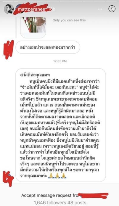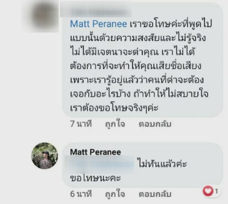 ส่วนอีกรายหนึ่งเป็นนักศึกษาสาวที่ส่งข้อความด่าทอผ่านแชทสตอรี่ว่ากล่าวหาว่าเป็นเหมือนดอกไม้สีต่างๆ จึงทำให้แมททนไม่ไหวออกมาฟ้องเป็นกรณีศึกษา เรียกค่าเสียหายรายละ 1 ล้านบาท แต่ทั้งนี้ขึ้นอยู่กับดุลยพินิจของศาล และจะยังส่งฟ้องอย่างต่อเนื่องแม้ว่าคู่กรณีจะออกมาโพสต์ขอโทษแล้วก็ตาม