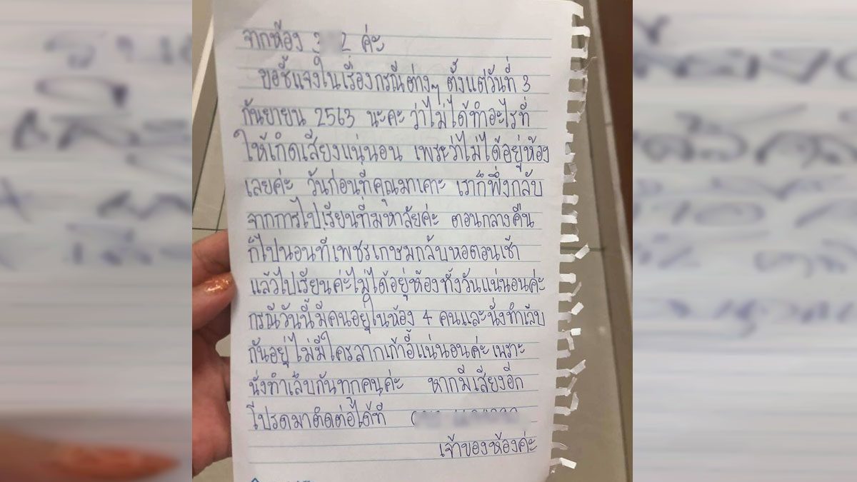 โดยผู้โพสต์ระบุว่า ไปบอกเจ้าที่เถอะค่ะ อย่ามาบอกหนู ตอนที่2 วันนี้เช่นเคยเรากลับหอดึกมาก เราเข้าหอประมาณ 4 ทุ่มกับเพื่อนๆและกำลังนั่งทำเล็บกันอยู่พอทำเสร็จก็เก็บของเข้านอน เราเลยเดินมาปิดไฟที่ข้างประตูแล้วก็เจอกระดาษแผ่นนี้ (รูปแรก) สอดอยู่ใต้ประตูเรา คือเรานั่งทำเล็บคราวนี้ด้วยกันสี่คน เอาเวลาที่ไหนไปลากเก้าอี้คะ