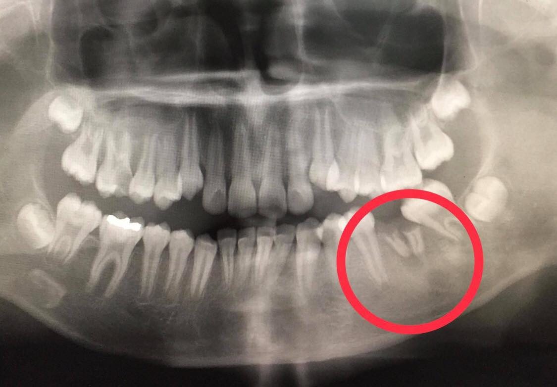 สาวท่านนี้เข้ามาหาคุณหมอเนื่องด้วยฝีบริเวณใต้คางเรื้อรังกว่า 4 ปี แผลดังกล่าวมีหนองไหลออกมาตลอดเวลา คุณหมอจึงทำการล้างแผล ขูดหนองออก และทำความสะอาดหลายครั้งแต่แผลบริเวณดังกล่าวก็ไม่หายไปสักที คุณหมอจึงส่งตัวคนไข้คนดังกล่าวไปพบทันตแพทย์เพื่อตรวจช่องปาก จึงค้นพบเรื่องที่น่าตกใจอย่างยิ่ง