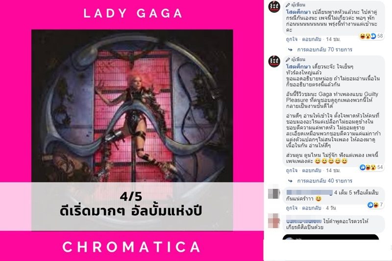 จนเจ้าของเพจ ต้องเปลี่ยนหัวข้อรีวิวใหม่จากคำว่า “4/5 อัลบั้มขยะ ที่มาในคราบของดนตรี POP DANCE” เป็นคำว่า “4/5 ดีเริ่ดมากๆ อัลบั้มแห่งปี” พร้อมบอกว่า “เดี๋ยวนะจ๊ะ ใจเย็นๆ ทัวร์ลงใหญ่แล้ว ขอแอดอธิบายหน่อย ถ้าไม่ยอมอ่านเนื้อในก็ขออธิบายตรงนี้แล้วกัน อันนี้รีวิวชม Gaga ทำเพลงแบบ Guilty Pleasure
