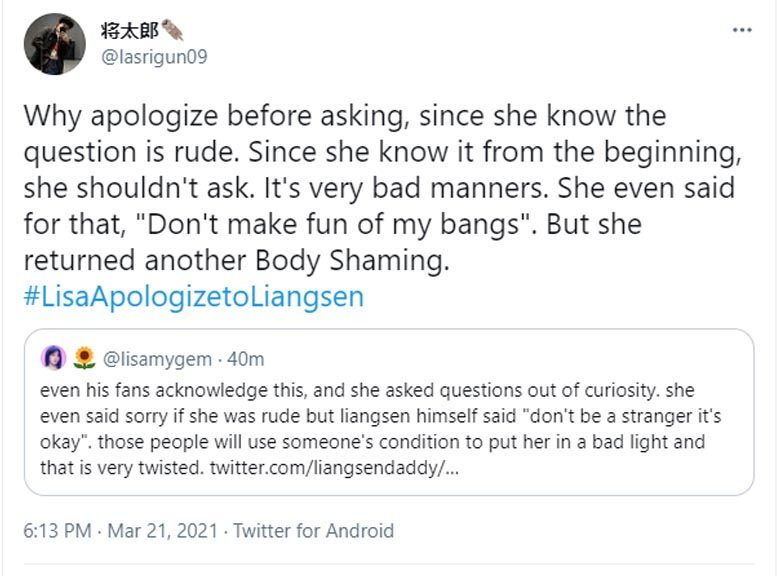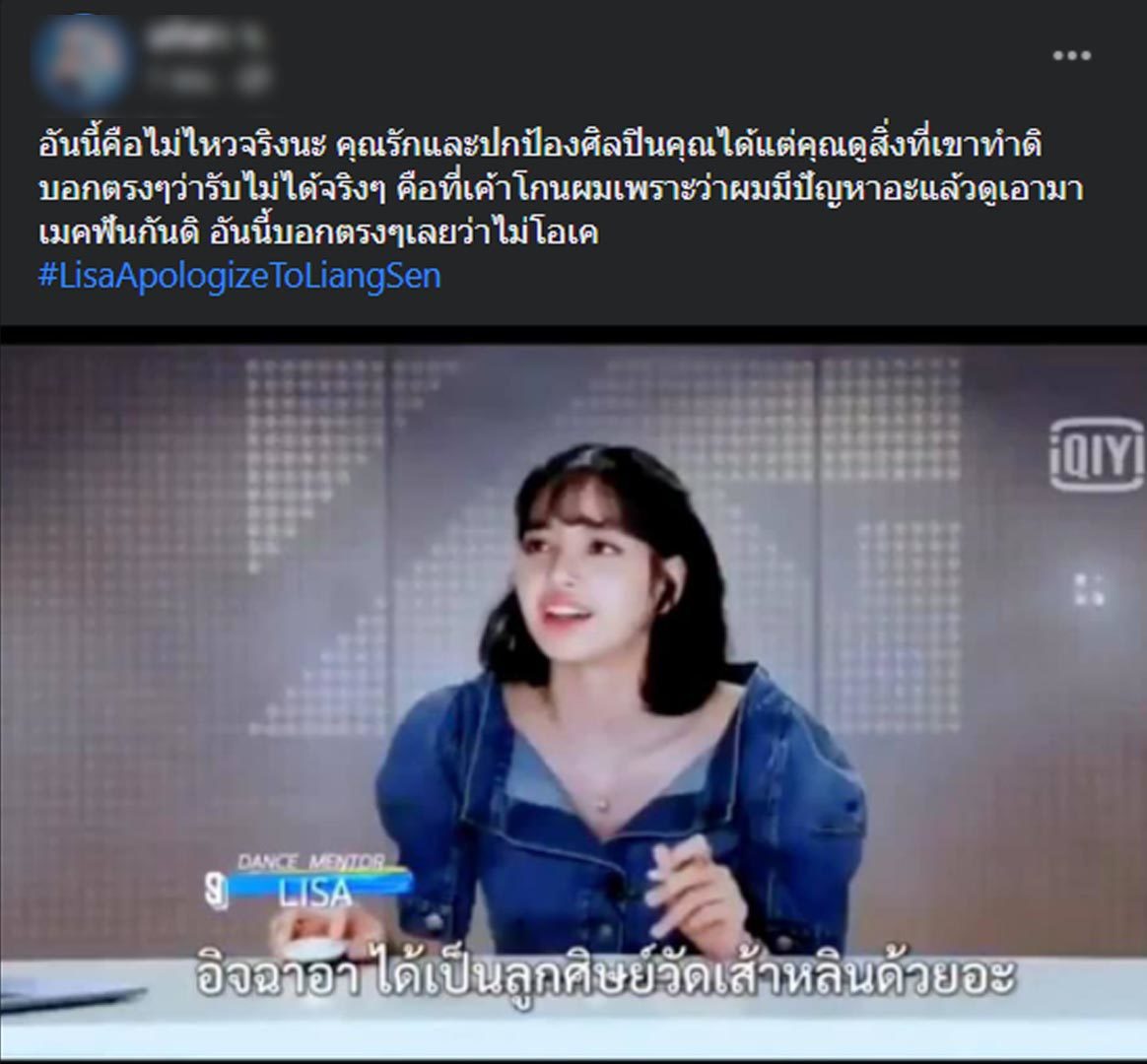 แฟนๆ รายการหลายคนออกมาเรียกร้องให้ ลิซ่า ออกมาขอโทษ Liang Sen ซึ่งชาวเน็ตส่วนใหญ่เห็นว่า ลิซ่าทำไม่ถูกต้องและแฟนคลับจำเป็นต้องแยกเเยะระหว่างนักร้องที่ชอบ และความถูกต้องบ้าง