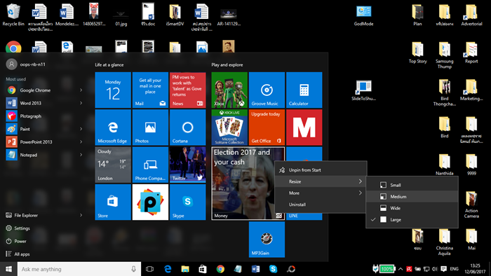 จุดนึ่งที่ทำให้ Windows10 แตกต่างจาก WindowsXP และ Windows7 คือ Shortcut ที่สตาร์ทเมนูแต่ส่วนใหญ่ Shortcut เหล่านั้นมักจะถูกจัดแต่งมาให้เรียบร้อยแต่มันก็ใช่ว่าจะสวยหรือถูกใจผู้ใช้ทุกคน หลายคนอยากปรับแต่งแต่ก็ไม่กล้ากลัวเดี๋ยวพลาดท่าจะพาลงงกันพอดี ซึ่งจริงๆ แล้ว Shortcut เหล่านี้ปรับแต่งได้ง่ายๆ สามารถคลิกค้างแล้วลากไปไหนมาไหนก็ได้ หรือหากต้องการให้ Shortcut ที่ใช้ประจำใหญ่ๆ ก็สามารถคลิกขวาที่ Shortcut นั้นสามารถปรับขนาดหรือเอาออกไปจากสตาร์ทเมนูก็ยังได้