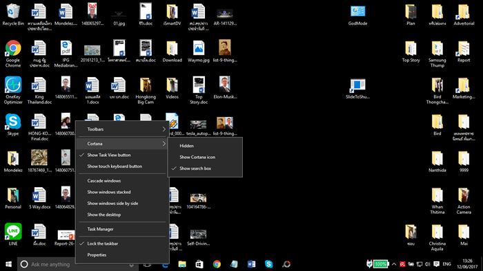 Taskbar หรือแถบการทำงานที่อยู่ด้านล่างสุดก็เป็นอีกส่วนหนึ่งของ Windows ที่มีความสำคัญ เนื่องจาก Taskbar ถือเป็นหนึ่งเอกลักษณ์ของ Windows ที่มีมาทุกยุคทุกสมัยและเทคนิคการคลิกขวาที่ Taskbar เพื่อตั้งค่าต่างๆ ของ Taskbar ก็ถือเป็นเทคนิคเบสิคที่มีใน Windows ทุกเวอร์ชั่น หากแต่ Windows10 มีในส่วนของ Cortana ที่สามารถตั้งค่าผ่านเทคนิคนี้ได้เช่นกัน