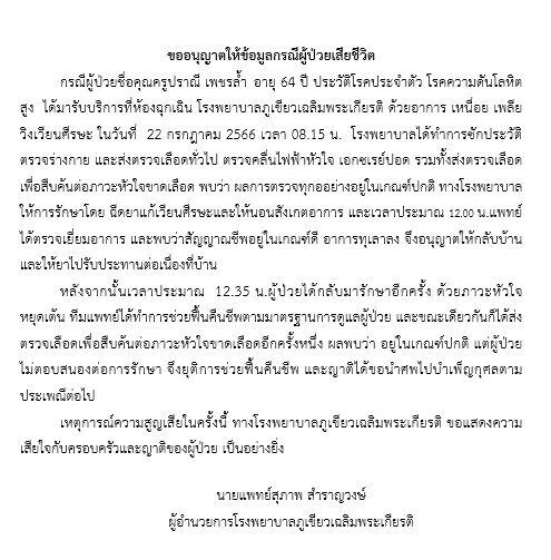 แต่ผู้ป่วยไม่ตอบสนองต่อการรักษา จึงยุติการช่วยฟื้นคืนชีพ และญาติขอนำศพออกจาก รพ.ไปบำเพ็ญกุศลตามประเพณีต่อไปในขณะนี้นั้น จากเหตุการณ์ความสูญเสียในครั้งนี้ที่ไม่มีใครอยากให้เกิดขึ้น ทางโรงพยาบาลขอแสดงความเสียใจกับครอบครัวและญาติของผู้ป่วยเป็นอย่างยิ่งในครั้งนี้ด้วย