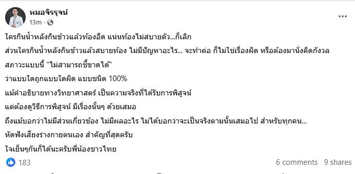 เพจดังเปิดข้อมูลโต้ กินข้าวห้ามกินน้ำ ไม่เป็นความจริง หมอแนะฟังเสียงร่างกายตนเอง