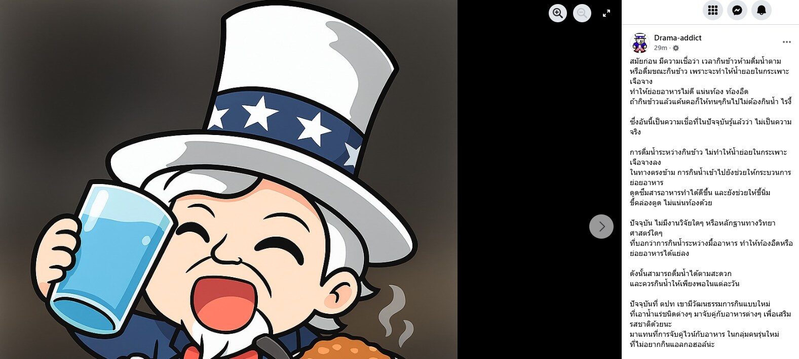 ต่อเรื่องดังกล่าว เพจ Drama-addict เผยอีกมุมของเรื่องดังกล่าว ความว่า สมัยก่อน มีความเชื่อว่า เวลากินข้าวห้ามดื่มน้ำตาม หรือดื่มขณะกินข้าว เพราะจะทำให้น้ำย่อยในกระเพาะเจือจาง