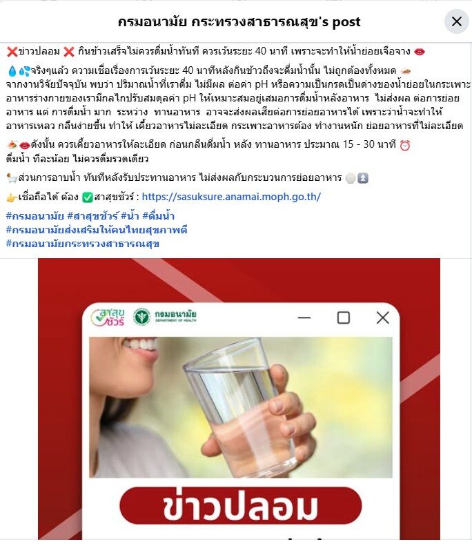 โดยก่อนหน้านี้ กรมอนามัย กระทรวงสาธารณสุข เคยโพสต์ในประเด็นดังกล่าว ความว่า กินข้าวเสร็จไม่ควรดื่มน้ำทันที ควรเว้นระยะ 40 นาที เพราะจะทำให้น้ำย่อยเจือจาง จริงๆแล้ว ความเชื่อเรื่องการเว้นระยะ 40 นาทีหลังกินข้าวถึงจะดื่มน้ำนั้น ไม่ถูกต้องทั้งหมด