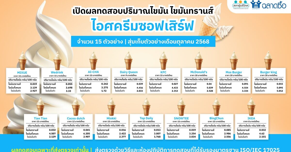 อย. ผนึกมูลนิธิเพื่อผู้บริโภค เปิดผลตรวจ "ไขมันทรานส์" ไอศกรีมซอฟต์เสิร์ฟ 15 แบรนด์ดัง ชี้กินเกิน 1 หน่วยบริโภค ต้องออกกำลังกาย