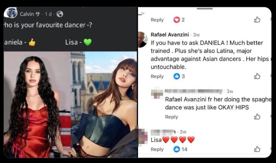 โดยเรื่องเริ่มจากมีเพจหนึ่งในเฟซบุ๊กได้โพสต์รูป ดาเนียลา และ ลิซ่า ก่อนถามชาวเน็ตว่าชอบใครมากกว่ากัน ซึ่ง ราฟาเอล ได้เข้ามาคอมเมนต์โพสต์นี้ ระบุว่า “ถ้าคุณยังต้องถาม ก็ต้องเป็น ดาเนียลา! เธอได้รับการฝึกฝนมาดีกว่ามาก แถมเธอยังเป็นลาติน่า ซึ่งถือว่าได้เปรียบกว่านักเต้นเอเชีย สะโพกของเธอไม่มีใครเทียบได้”
