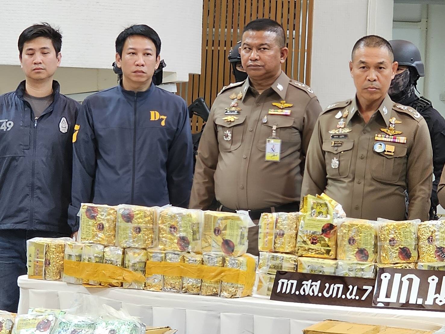 พ.ต.ท.อัครเดช พรมโพธิ์ พ.ต.ท.ภราดร เชิดชูล้ำตระกูล พ.ต.ท.ธวัชชัย โป๊ะโดย รอง ผกก.สส.บก.น.7 พ.ต.ท.ศุภชัย สงวนสิทธิ์ สว.กก.สส.บก.น.7 และเจ้าหน้าที่ตำรวจ กก.สส.บก.น.7 แถลงจับกุมนายชัย อายุ 65 ปี นายภสณณ อายุ 51 ปี นายสุขเศกฉันท์ อายุ 47 ปี