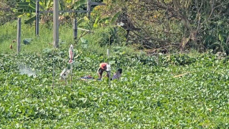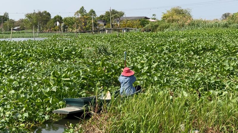 ขณะที่เรือหางยาวที่ติดเครื่องยนต์ของชาวบ้านรายหนึ่ง พยามขับเรือฝ่าดงทึบของผักตบชวา แต่สุดท้ายก็ไม่สามารถไปต่อได้ จนต้องดับเครื่องยนต์แล้วใช้ไม้พายพยามแหวกกอผักตบเพื่อเปิดทางเดินเรือ ซึ่งใช้เวลาหลายสิบนาทีกว่าจะเดินไปข้างหน้าได้ทีละเล็กทีละน้อย