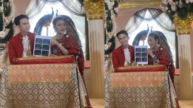 โดยทั้งคู่ได้นำภาพอัลตราซาวด์ ลูกน้อยในครรภ์ออกมาโชว์ ด้วยใบหน้าสุดปลื้มปริ่มทั้งเจ้าบ่าวและเจ้าสาว ท่ามกลางเสียงกรี๊ดดีใจของคนในงาน