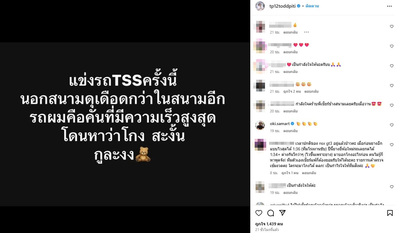ทำเอางงโดนหาว่าโกง ต๊อด ปิติ สามี นุ่น วรนุช โพสต์ข้อความว่า “แข่งรถ TSS ครั้งนี้ นอกสนามดุเดือดกว่าในสนามอีก รถผมคือคันที่มีความเร็วสูงสุด โดนหาว่าโกงซะงั้น กูละงง”