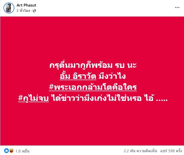 พร้อมทั้งโพสต์รัวๆอีกว่า “กรุตื่นมากูก็พร้อม รบ นะ อั้ม อิราวัต มึงว่าไง #พระเอกกล้ามโตคือใคร #กูไม่จบ ได้ข่าวว่ามึงเก่งไม่ใช่หรอ ไอ้ …..”