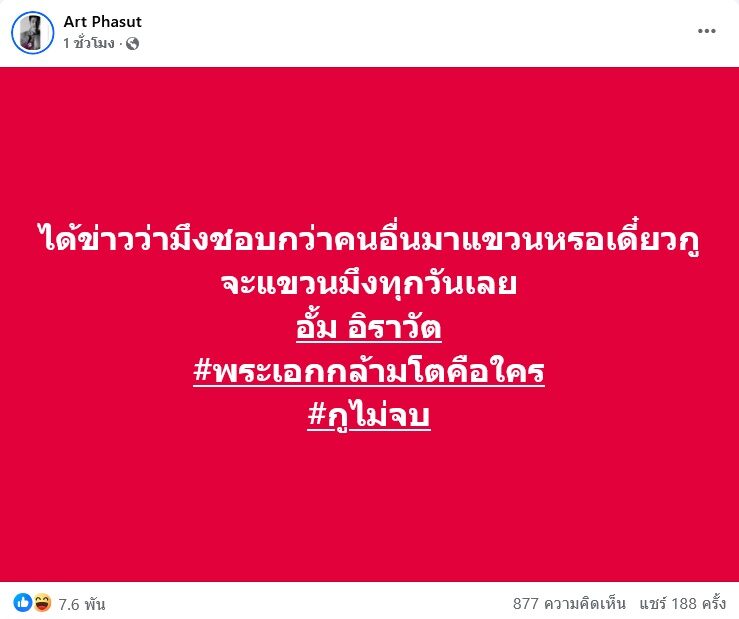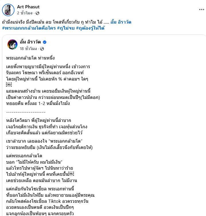 อ่านข่าวต้นฉบับได้ที่ : อาร์ต พศุตม์ เดือดลั่นกูไม่จบ ถาม อั้ม อิราวัต ปิดเมนต์ลบโพสต์ทำไม พระเอกกล้ามโตคือใคร