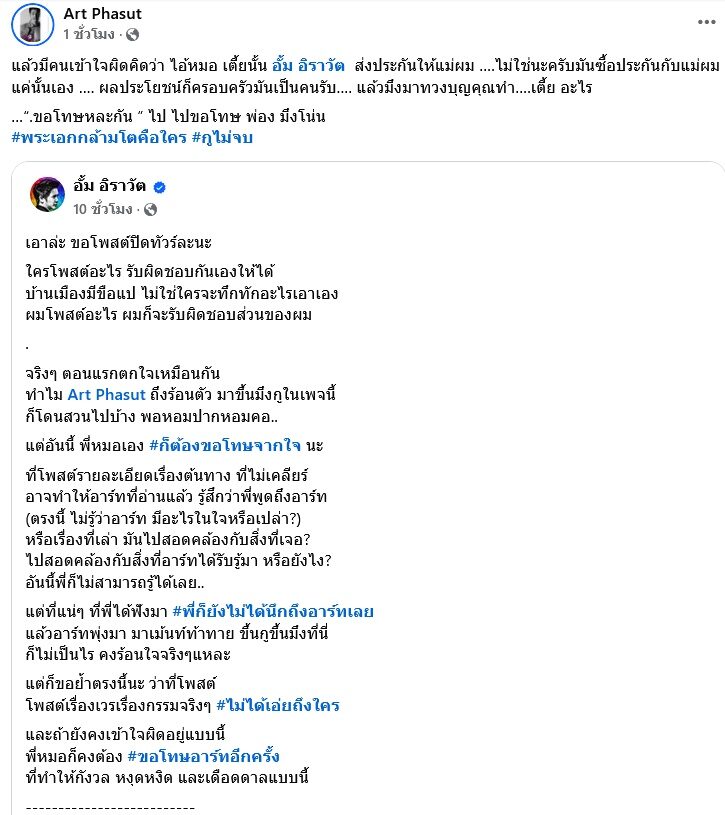 จากกรณีดราม่าเดือดข้ามคืนมาถึงเช้าเลย ประเด็น อั้ม อิราวัต โพสต์เล่านิทานถึงพระเอกกล้ามโตเนรคุณคนเคยปั้น ด้าน อาร์ต พศุตม์ ก็เข้ามาคอมเมนต์ใต้โพสต์ แจกแจงทุกประเด็น พร้อมทั้งท้าไปออกโหนกระแสสักรอบ ด้าน อั้ม ก็มาโต้ยันพูดถึงพระเอกกล้ามโต ไม่ได้หมายถึง พระรอง พร้อมทั้งออกมาขอโทษขอปิดทัวร์ไปนั้น