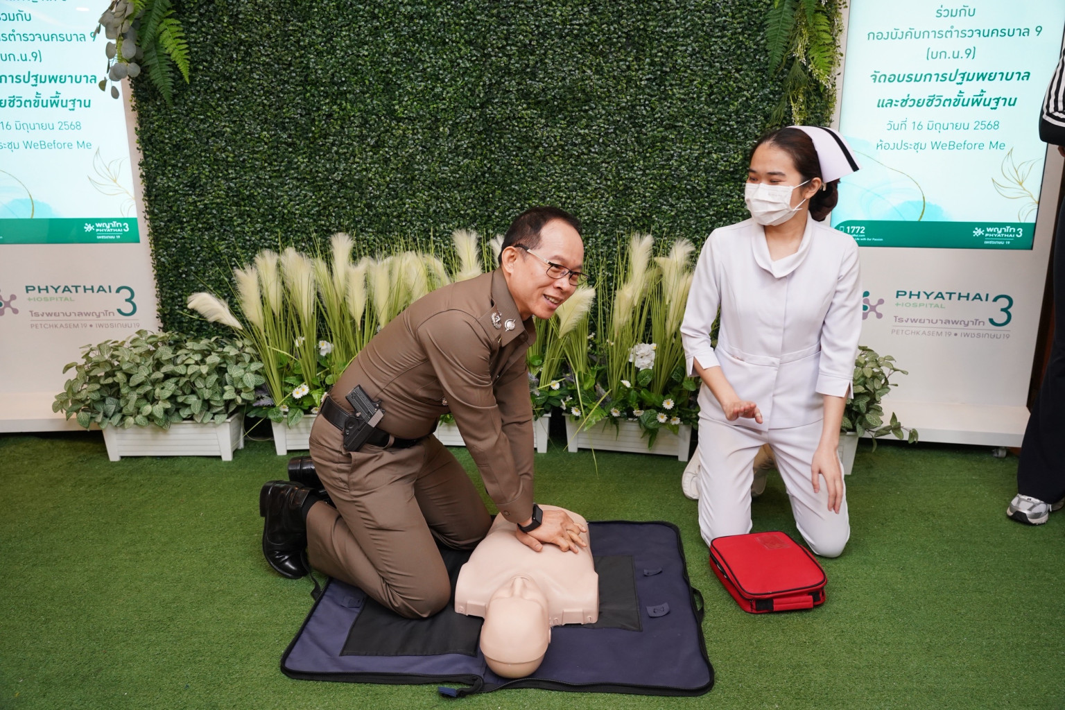 เมื่อเวลา 09.00 น. ของวันที่ 16 มิ.ย.68 พล.ต.ต.คมสิทธิ์ รังไสย์ ผบก.น.9 เป็นประธานในพิธีฯ พร้อมด้วย นพ.อภิชัย โตวณะบุตร ผู้ช่วยผู้อำนวยการโรงพยาบาลพญาไท 3, พ.ต.อ.ชัยพันธุ์ เพ็ชรสดศิลป์ รอง ผบก.น.9, พ.ต.อ.เลิศศักดิ์ เขียมทรัพย์ ผกก.สน.หลักสอง, เจ้าหน้าที่ตำรวจ สน.ภาษีเจริญ และเจ้าหน้าที่ตำรวจ ฝอ.บก.น.9 ร่วมเปิดโครงการอบรม CPR “เราทำความดีด้วยหัวใจ” โดยนครบาล 9 ร่วมกับ รพ.พญาไท 3 ชวนคุณทำดีด้วยหัวใจ เพื่อดูแลคนที่คุณรักและห่วงใย ด้วยจิตอาสานาที