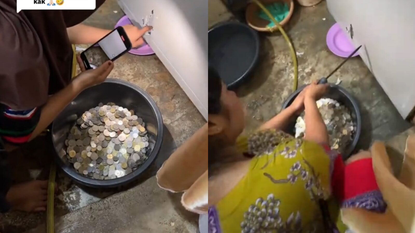 ผู้ใช้ติ๊กต็อก @kachacha528 ได้โพสต์วิดีโอขณะที่เธอเจาะรูในประตูห้องน้ำ ค่อย ๆ นำเหรียญจำนวนมากออกมาจนเต็มกะละมังสีดำขนาดใหญ่