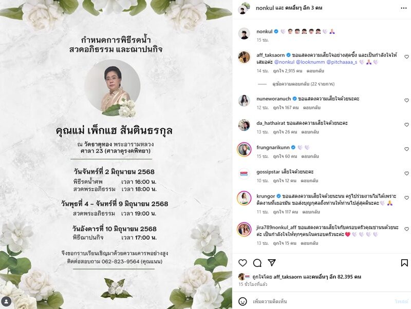 โดย แอฟ ก็เข้ามาคอมเมนต์แสดงความเสียใจและให้กำลังใจ นนกุล และครอบครัว ท่ามกลางเพื่อนพี่น้องในวงการต่างเข้ามาร่วมแสดงความเสียใจจำนวนมาก