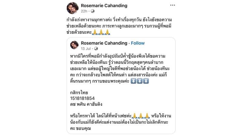 ดิ้นรนหางานสุดชีวิต แต่ก็ยังไปต่อไม่ไหว จนต้องออกมาโพสต์ขอความช่วยเหลือจากผู้ใหญ่ใจดีให้ช่วยอุปถัมภ์น้องพีเจ ลูกชาย สำหรับโรสแมรี่ คาฮันดิง อดีตนักร้องยุค 90 เจ้าของเพลงดังอย่าง ให้ทำอย่างไร และเปล่ามีน้ำตา