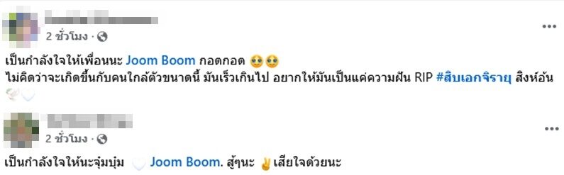 -เป็นกำลังใจให้เพื่อนนะ Joom Boom กอดกอด ไม่คิดว่าจะเกิดขึ้นกับคนใกล้ตัวขนาดนี้ มันเร็วเกินไป อยากให้มันเป็นแค่ความฝัน RIP #สิบเอกจิรายุ สิงห์อ้น
