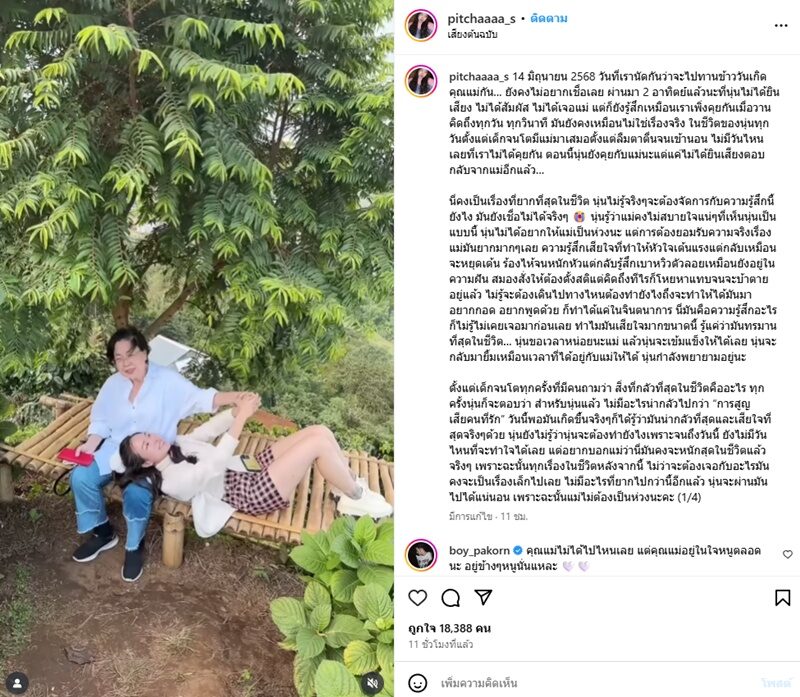 ด้าน นุ่น พิชชาธร น้องสาว ก็โพสต์สุดเศร้าวันที่ 14 มิถุนายน 2568 วันที่เรานัดกันว่าจะไปทานข้าววันเกิดคุณแม่กัน… ยังคงไม่อยากเชื่อเลย… โดย บอย ก็มาให้กำลังน้องด้วยเช่นกันว่า “คุณแม่ไม่ได้ไปไหนเลย แต่คุณแม่อยู่ในใจหนูตลอดนะ อยู่ข้างๆหนูนั่นแหละ”