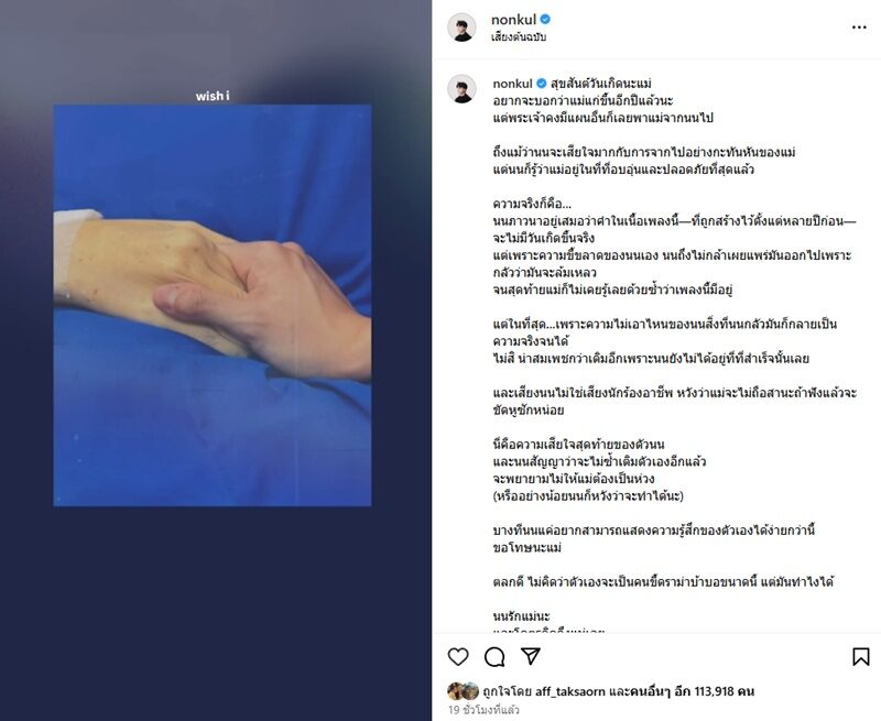 ขณะที่ นนกุล ก็โพสต์เศร้าภาพจับมือคุณแม่ พร้อมเสียงร้องเพลงของเจ้าตัว โดยอวยพรวันเกิดคุณแม่ พร้อมความในใจถึงคุณแม่ โดยบอกจะเป็นความเสียใจสุดท้าย จะพยายามไม่ให้แม่ต้องเป็นห่วง