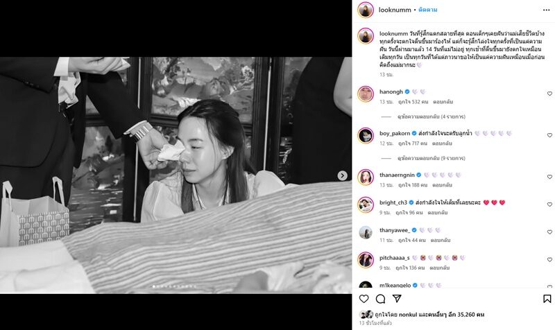 “วันที่รู้สึกแตกสลายที่สุด ตอนเด็กๆเคยฝันว่าแม่เสียชีวิตบ้าง ทุกครั้งจะตกใจตื่นขึ้นมาร้องไห้ แต่ก็จะรู้สึกโล่งใจทุกครั้งที่เป็นแค่ความฝัน วันนี้ผ่านมาแล้ว 14 วันที่แม่ไม่อยู่ ทุกเช้าที่ตื่นขึ้นมายังตกใจเหมือนเดิมทุกวัน เป็นทุกวันที่ได้แต่ภาวนาขอให้เป็นแค่ความฝันเหมือนเมื่อก่อน คิดถึงแม่มากนะ” โดย บอย ปกรณ์ ก็เข้ามาคอมเมนต์ด้วยว่า “ส่งกำลังใจนะครับลูกน้ำ” , หน่อง ธนา ก็คอมเมนต์อิโมจิหัวใจสีขาว