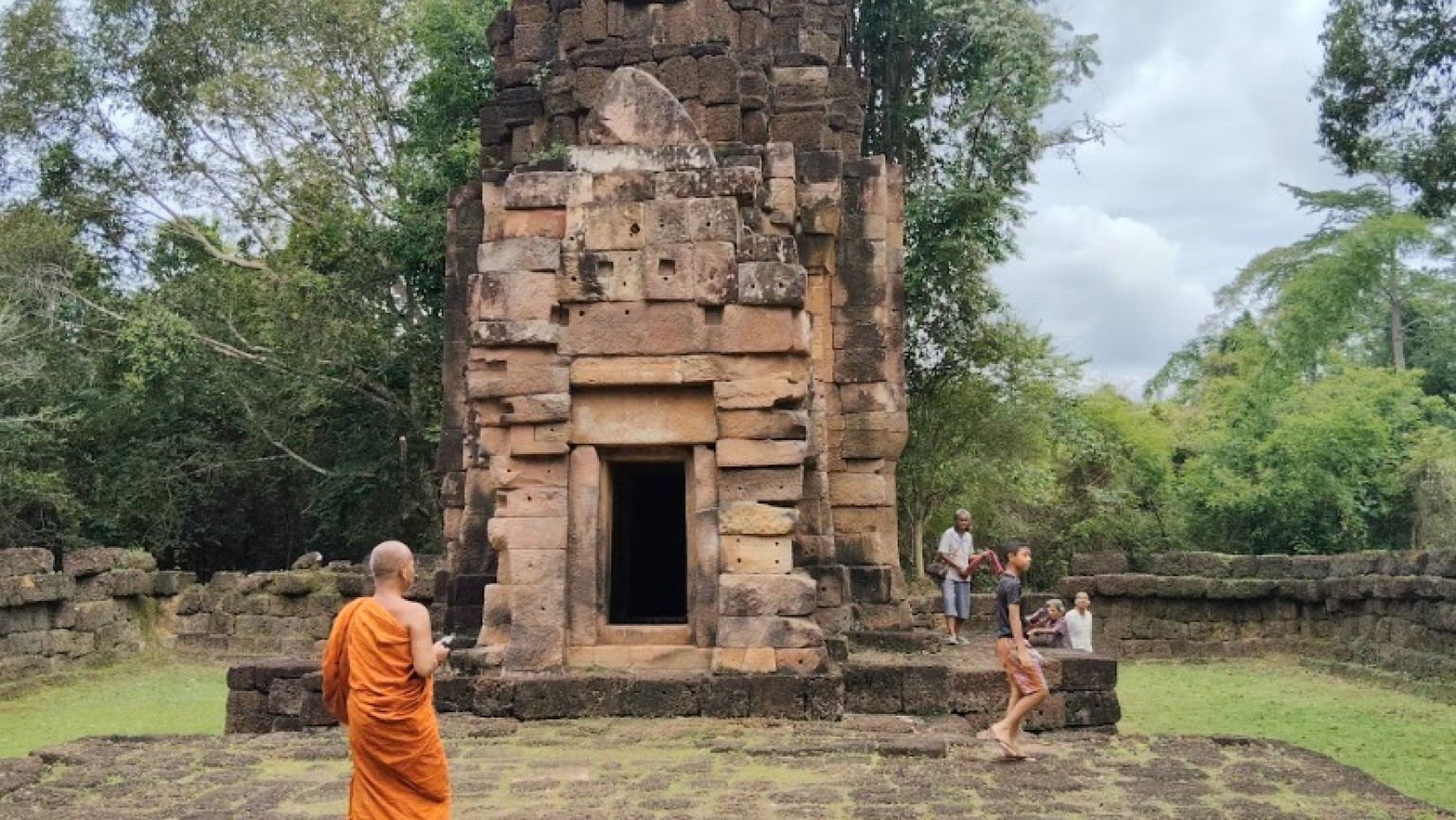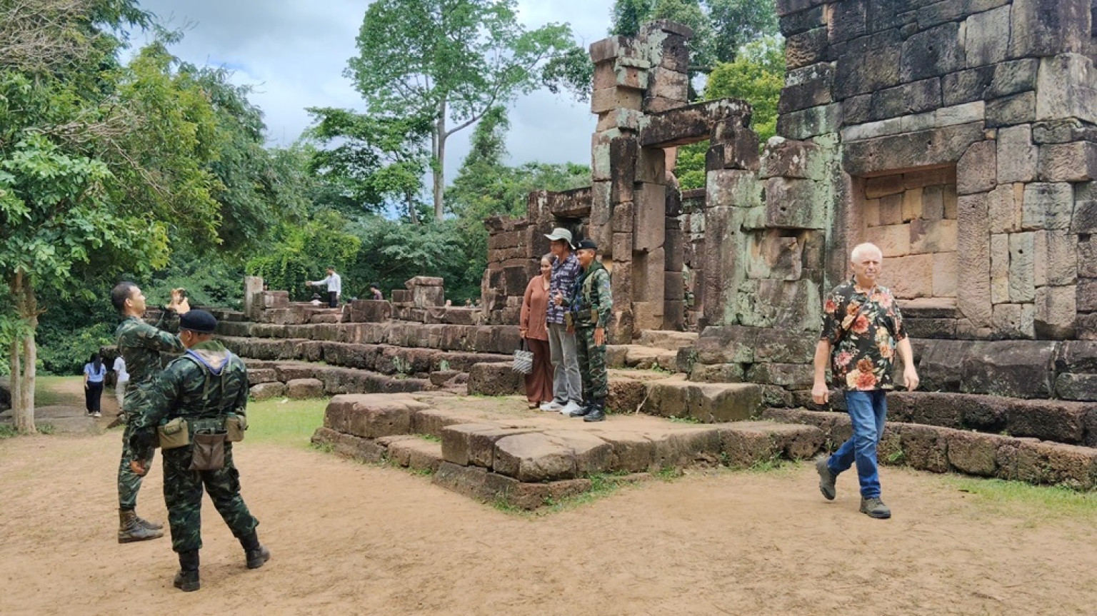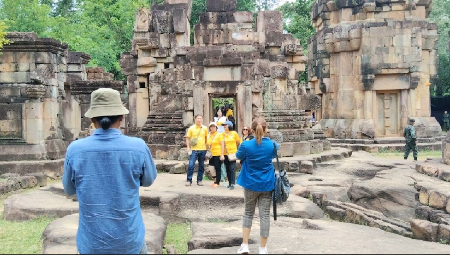 ซึ่งมี จนท.ทหารคอยเป็นไกด์นำชมตัวปราสาท ท่ามกลางการรักษาความปลอดภัยจาก จนท.ทหารอย่างใกล้ชิด ซึ่งทหารกัมพูชาก็เข้ามาสังเกตุการณ์ในตัวราสาทเช่นกัน ขณะที่ประชาชนต่างให้กำลังใจ จนท.ทหารที่ช่วยปกป้องรักษาธิปไตยของไทยไว้ และต่างพูดเป็นเสียงเดียวกันว่าปราสาทตาเมือนธมเป็นของไทย คนไทยจะไม่ยอมให้เป็นของกัมพูชา ขอเป็นกำลังใจให้ทหารไทยปกป้องรักษาไว้ให้ลูกหลาน ขณะที่นักท่องเที่ยวต่างกราบไหว้สิ่งศักดิ์สิทธิ์ในตัวปราสาท เพื่อขอพรให้ปกป้องรักษาแผ่นดินไทย ให้ จนท.ทหารปลอดภัย อย่าให้กัมพูชามาเอาปราสาทตาเมือนธม ตาเมือนโต๊ดและปราสาทตาควายได้ เพราะเป็นของประเทศไทย