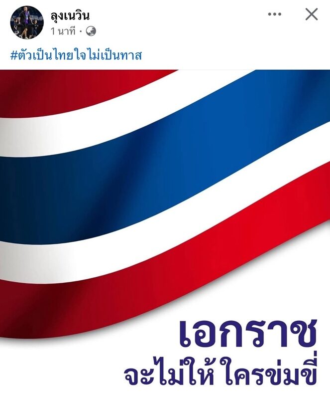 เมื่อเวลา 20.13 น. วันที่ 18 มิ.ย.68 ผู้สื่อข่าวรายงานว่า นายเนวิน ชิดชอบ ประธานสโมสรบุรีรัมย์ยูไนเต็ด ได้โพสต์ข้อความและภาพ ผ่าน เพจ “ลุงเนวิน” เป็น รูปธงชาติไทย ข้อความระบุว่า “เอกราชจะไม่ให้ใครข่มขี่” พร้อมติดแฮชแท็กว่า #ตัวเป็นไทยใจไม่เป็นทาส